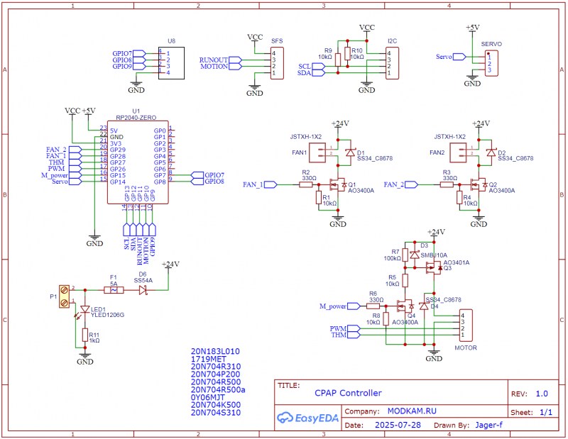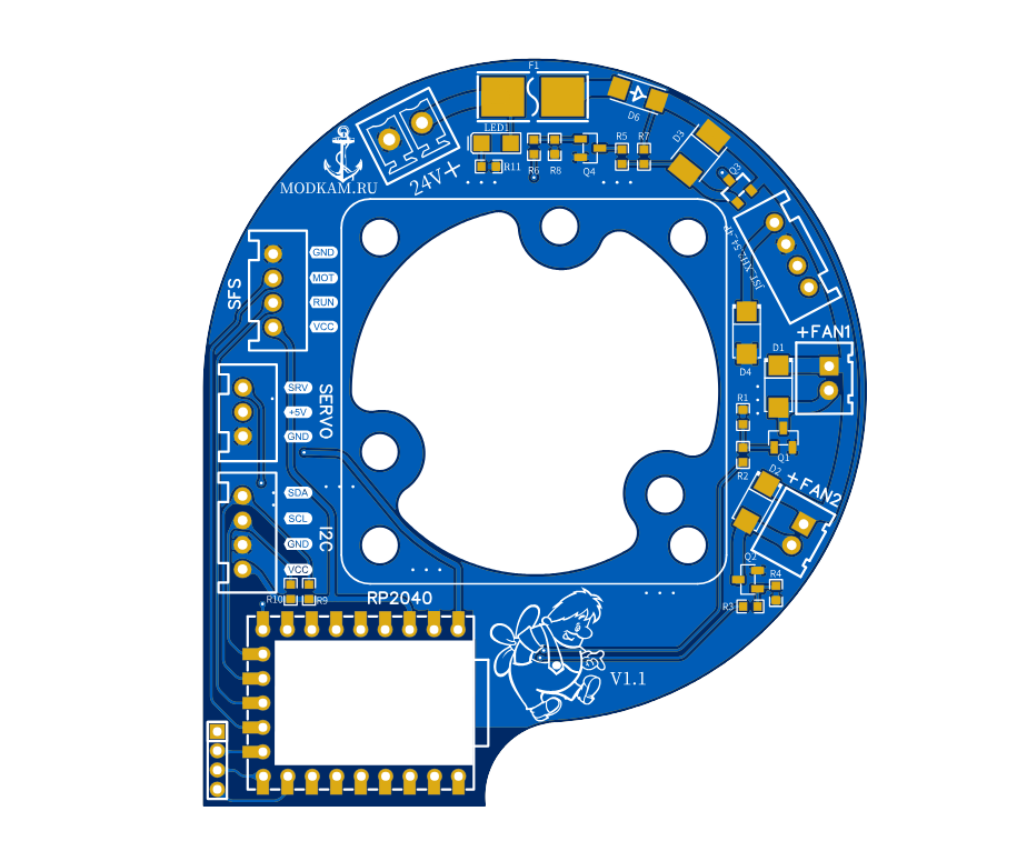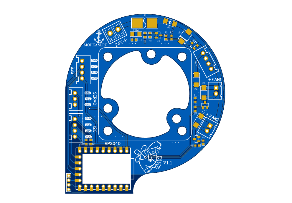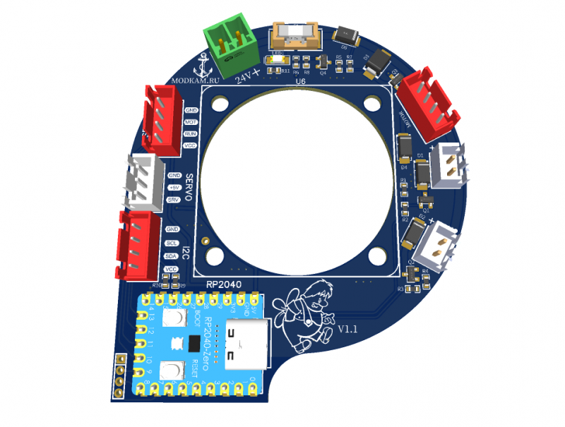 Плата толщиной 1.6мм. Модуль RP2040-Zero предпочтительно использовать с распаянными header (удобно подключать кабель)